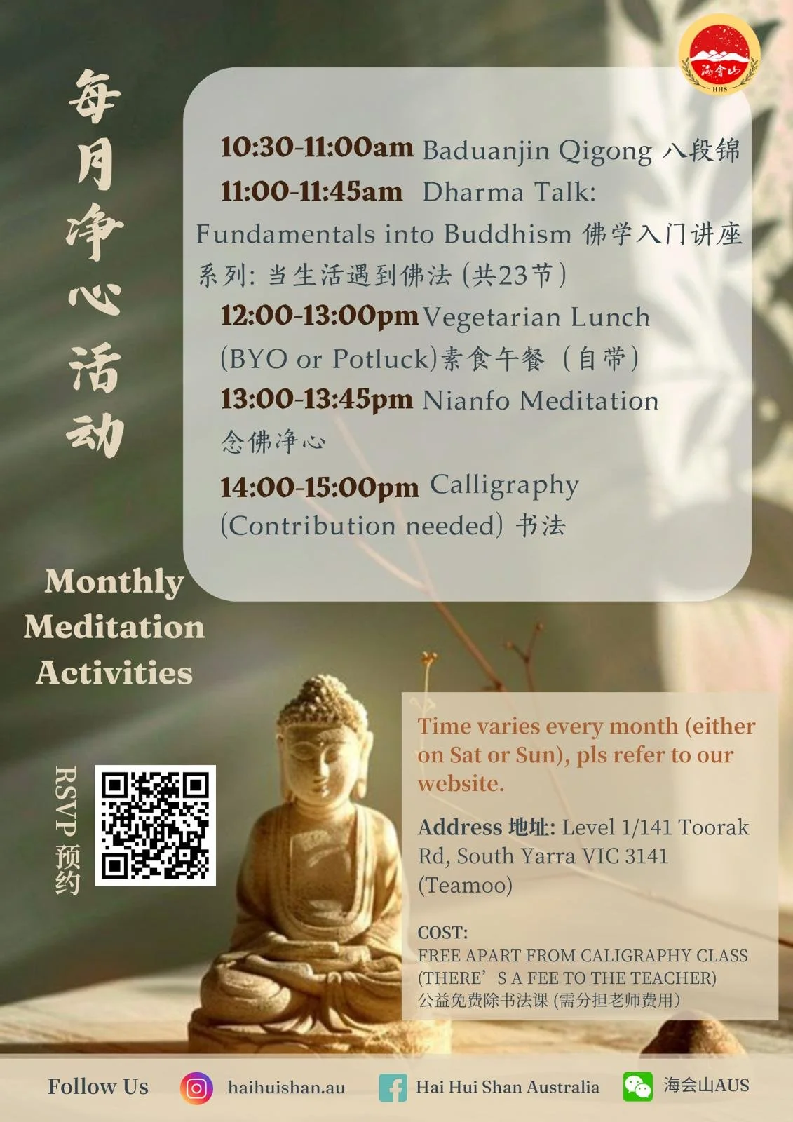 Our monthly Dharma talk & mindfulness activities include a wide range of interesting programs such as Baduanjin Qigong to help you start the day with positive energy, Dharma talk & FAQs: Fundamentals into Buddhism - we will look at how to apply the wisdom from the Buddha’s teachings to help solve our daily problems (it’s not religious, anybody can practice Buddhism, as the Buddha simply teaches us the methods to lead us to live a stress-free and happier life.)